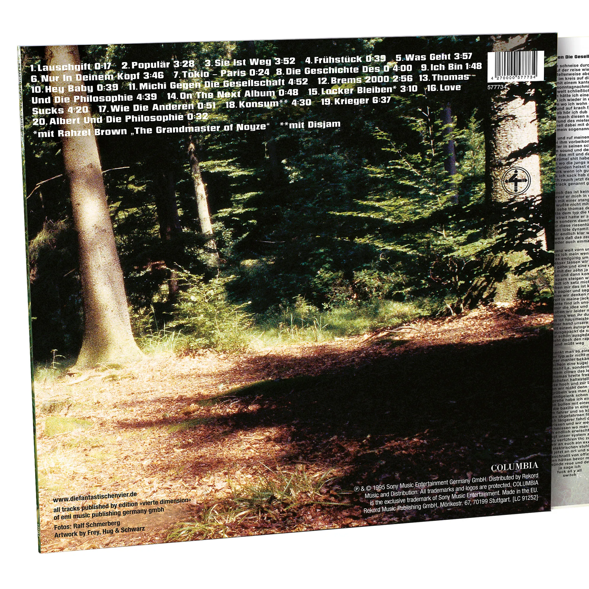 Lauschgift ist das vierte reguläre Studioalbum der Fantastischen Vier aus dem Jahr 1995. Mit diesem Album entwickelten Die Fantastischen Vier ihren Stil konsequent weiter. Von dem teilweise psychedelischen Klangbild des Vorgängeralbums ”Die 4. Dimension” ist nur mehr wenig übrig geblieben. Die Texte behandeln unter anderem das Leben als erfolgreicher Musiker (Populär, Locker bleiben), sind aber zum Teil auch nachdenklich bis philosophisch (Thomas und die Philosophie, Ich bin, Krieger). Sie ist weg und Love Sucks beleuchten das Thema Liebe. Das Album erreichte in Deutschland, Österreich und der Schweiz jeweils die Top-10 der Charts. Als Singles wurden ”Sie ist weg”, ”Populär ”und ”Nur in deinem Kopf” ausgekoppelt. Sie ist weg wurde zur LIVE Hymne und erreichte in Deutschland Platz #1 und in der Schweiz Platz #2 der Single Charts!